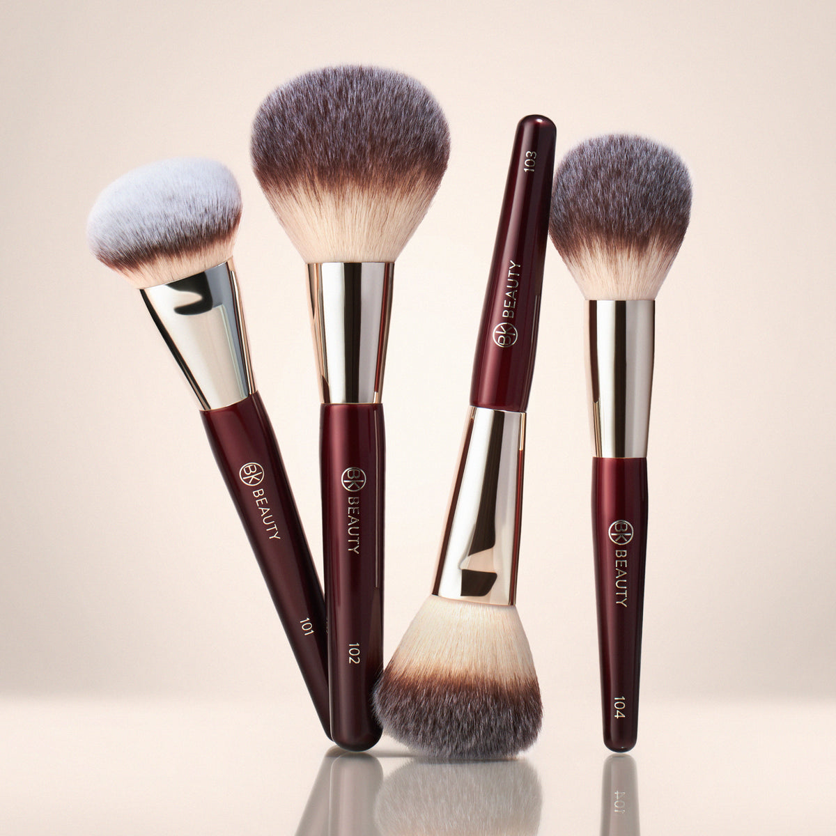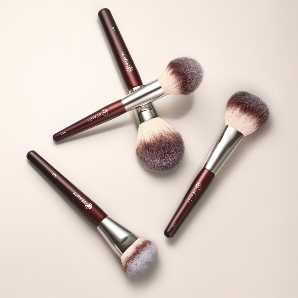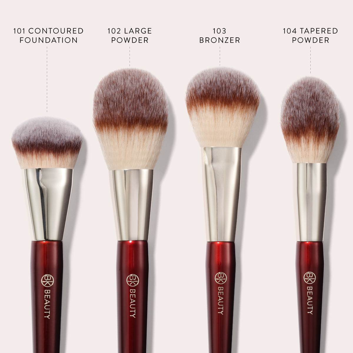 - 104 Tapered Powder: Use the tip to apply powder blush with precision, or the side of the brush to apply setting powder to the center of the face.